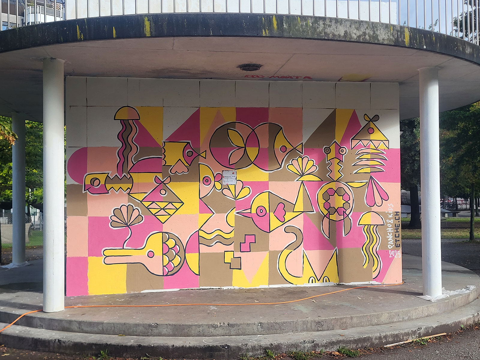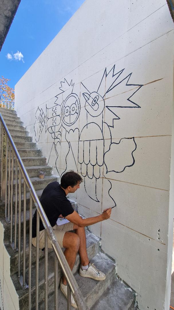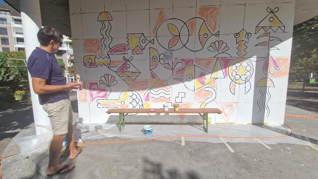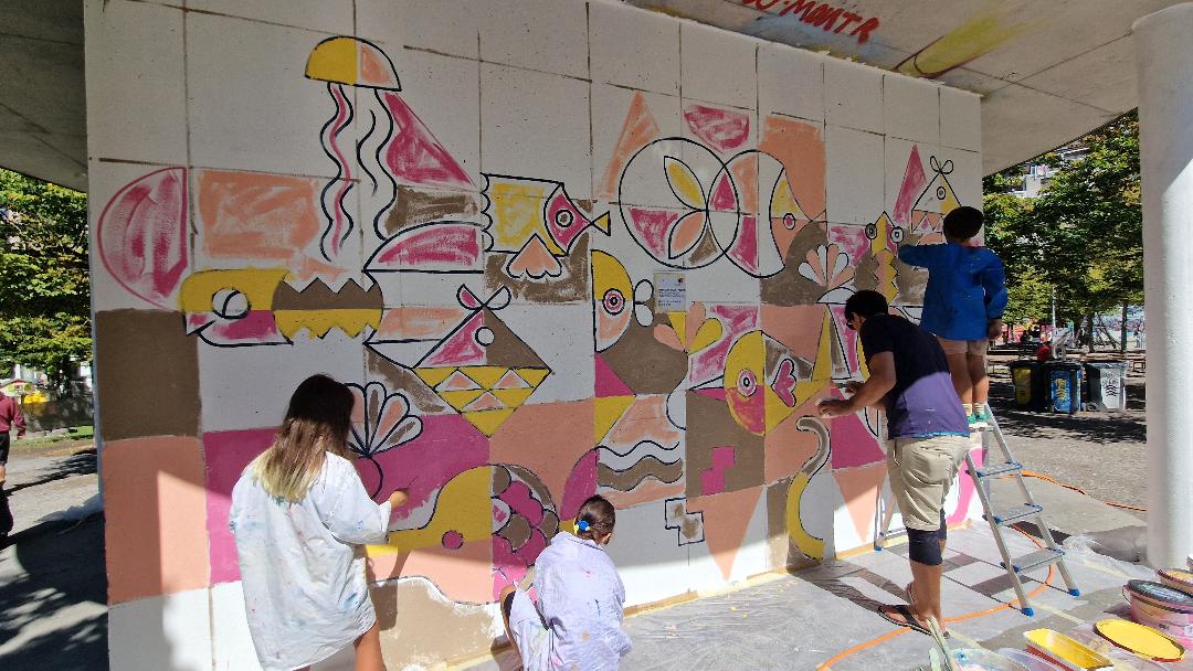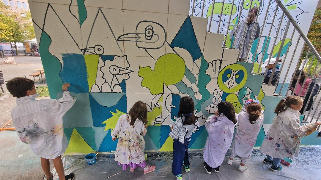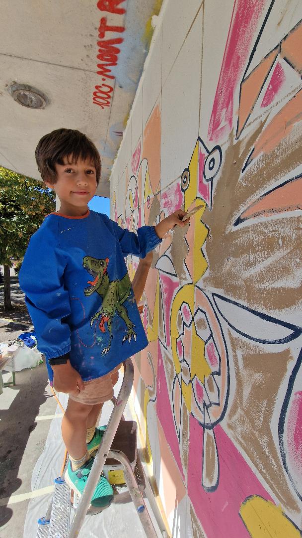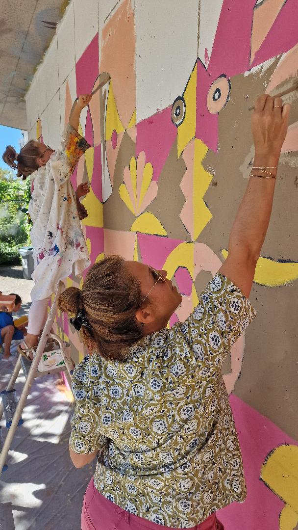 Réalisation de fresques murales en collaboration avec les enfants et les parents. Activité intergénérationnelle propice à la cohésion sociale.
